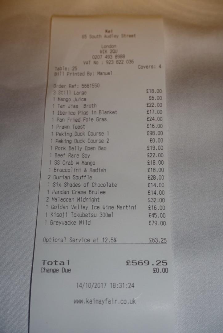 Certainly not an experience I regretted but I walked away from Kai feeling good to have seen and done it but with no burning desire to return immediately. The food was unquestionably nice but it was a shame to see hardly any ‘Western Chinese’ favourites; something that has changed in recent times looking at their online example menus within 2017. It has held its star since the time of my visit which is all to their credit and is worth a drop in but one cannot help thinking once inside that it is somehow more geared for those that live in the nearby vicinity rather than a food event for everyone. Things change a lot so another visit will be merited whenever I can do this.