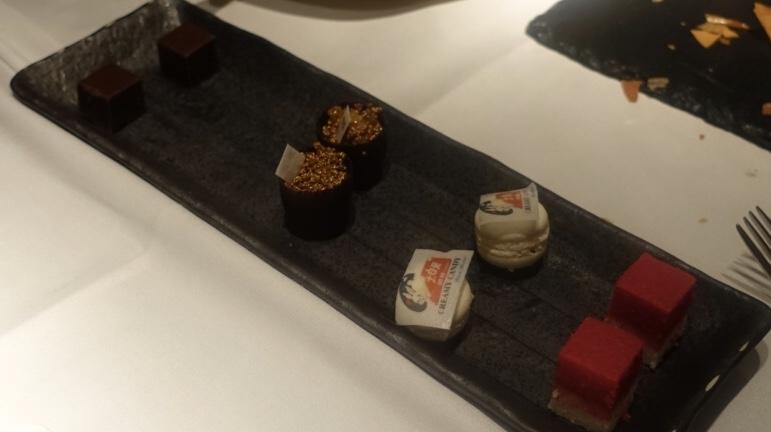 With the exception of the chocolate and peanut parfait dessert which was far to heavy (almost like a lump of dense matter), the durian soufflé was wonderfully original and done (not too pungent) and likewise, the pandan creme brûlée served with Malaysian coffee ice cream, ‘Milo’ powder and tuile was an absolute dream to have. Actually, one of the best desserts had on record(!), which was surprising as desserts are not really the forte of Asian restaurants in my experience, so a double pleasure. Petit fours followed a similar formula from years gone and by the end of the meal everyone was more than content with the offerings.