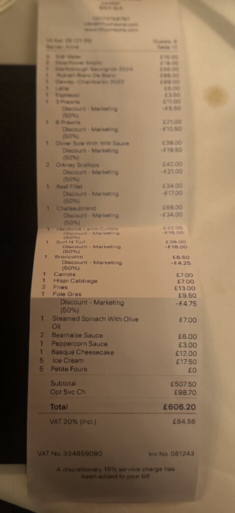 I think this is a delightful venue and being a luxury restaurant guide member, I will have no hesitation in going back for the Dover Sole on a Tuesday evening and I am interested to try the other meat dishes. Thoroughly recommended although the service charge at 19% (which is frankly unheard of for the UK) and although the team were accommodating, I think it is a reminder for all to check their bills for ‘optional service charges’ and judge accordingly. You have been forewarned, but I do recommend this venue so there is no confusion.