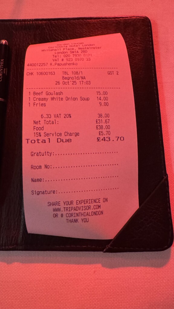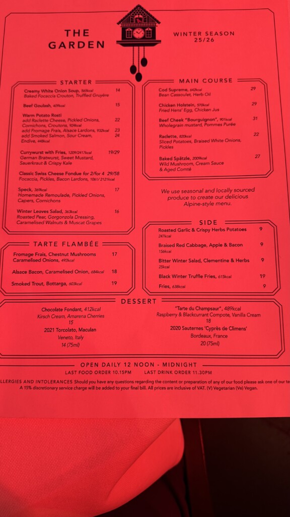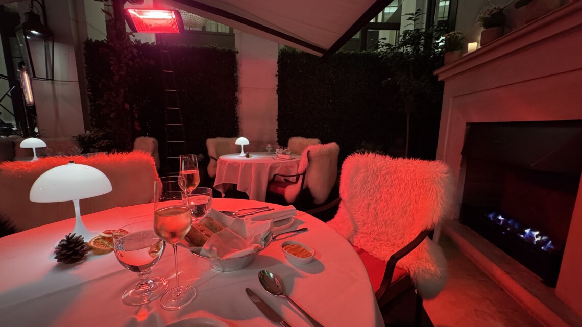 This is a little gem of London. Sheltered from the rain by umbrellas and with heat lamps and fireplaces for any cold, this small, courtyard area has been converted in to a charming all day dining (from lunchtime) area of the 5 star Corinthia Hotel. It is also linked to the Luxury Restaurant Guide (LRG) for a complimentary glass of champagne when dining on advertised days. I have been here on three occasions now and each time has produced very satisfying snacks and ‘fillers’ including a frankly superb nduja mini pizza (excellent dough), a quality, creamed white onion soup with truffle and something I haven’t had in a long time, raclette (a Swiss dish of melted cheese on potatoes with garnish). The hospitality here is also a quality act and I especially enjoy the staff do not put any pressure on you to have a three course meal each time and look after you to have whatever little bits or full meal you wish. I really rate here and recommend you visit. If you are a LRG member, make sure to quote your membership in the notes of the booking online.